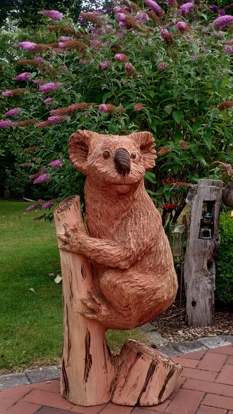 Kunstvoll in Handarbeit mit der Motorsäge aus ganzen Stämmen geschnitzte Holzskulpturen und mehr.